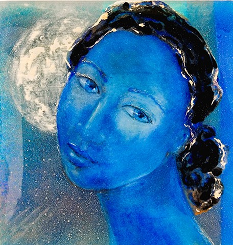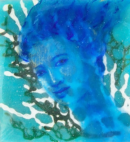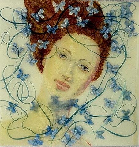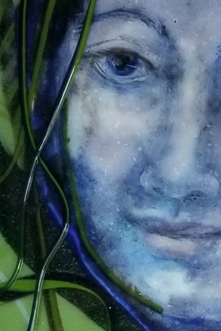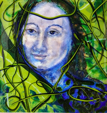 cast resin colored with copper oxides are sewn onto felted wool and silk