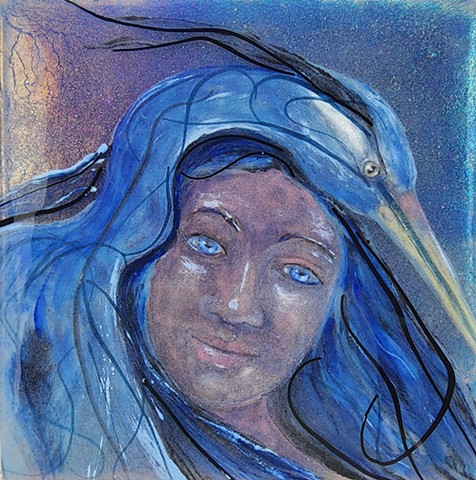 Shibori dyed silk, felted wool, silk thread, Japanese glass seed beads, cold cast glass